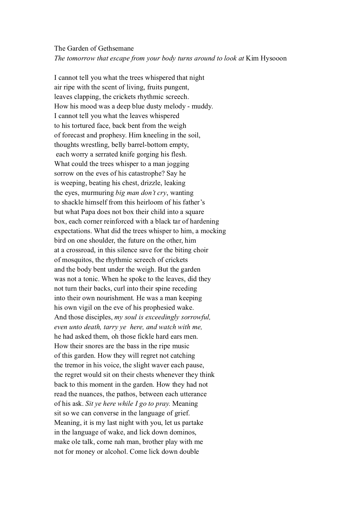 These questions generated lyrical lines and images, a grounded knowledge of both character and place, and a certainty about the psychological terrain I was navigating. Next, I looked for a quote from those gathered in my notebook to kick-start the poem. Kym Hyesoon’s: “The tomorrow that escape from your body turns around to look at. . .” felt apt.